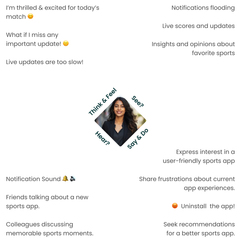 This tool aids in comprehending our users’ needs, uncovering what they think, feel, see, hear, and do.
